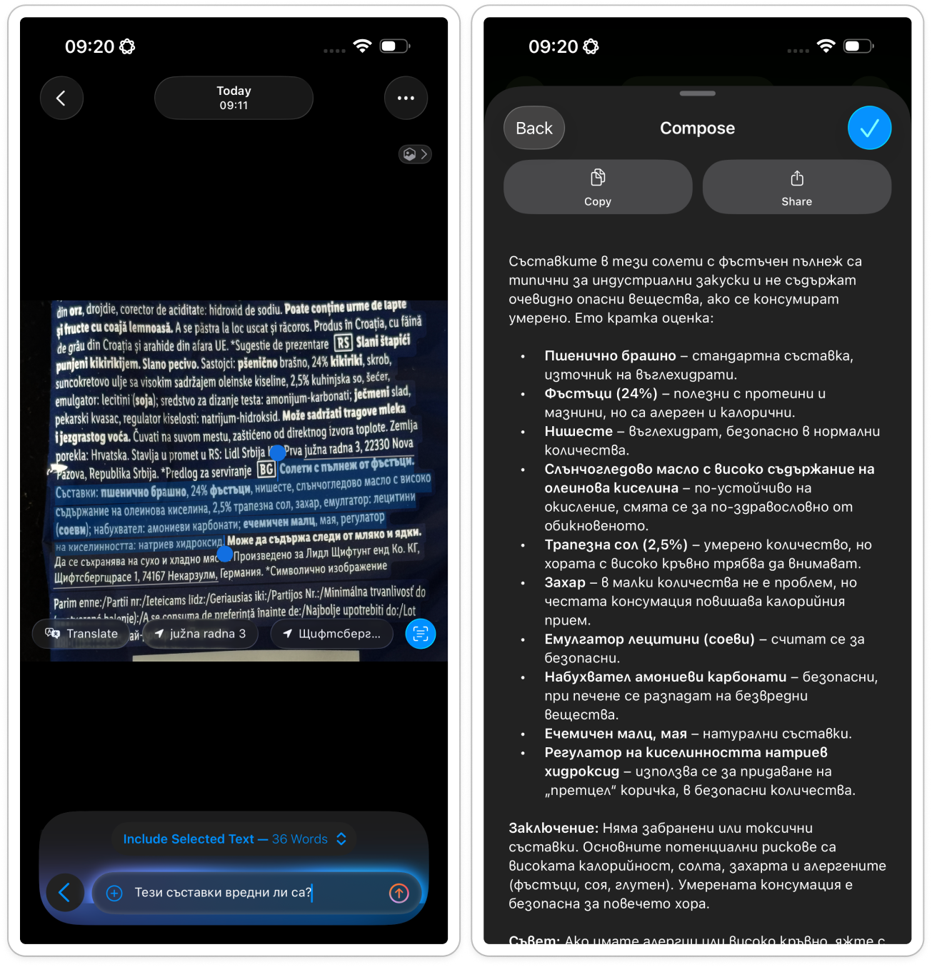 Малко хора го знаят, но инструментите за писане (Writing Tools) не помагат само за реално писане на текст, а и за всякакви други действия - т.е. може да задавате въпроси на български за даден текст в което и да е приложение, и ChatGPT да отговори директно. Пример - вярно ли е това, какво виждаш, обясни това, вредни ли са тези съставки, и изобщо всичко което ви вълнува - от текст в нета, снимка, скрийншот, и т.н.
