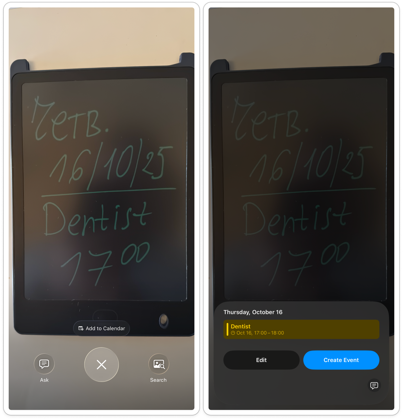 3. Visual Intelligence разпознаването на събития работи и от ръкописен текст - зависи какво е, как е написано и т.н. Ето тук се справи перфектно: